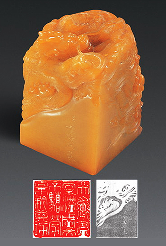 "臣董誥敬篆"款 成交價(jià):RMB2,420,000 拍賣(mài)公司:北京翰海拍賣(mài)有限公司 日期:2006-06-26 說(shuō)明: 此章隨形紐雕海水蟠龍紋,運(yùn)用了高浮雕、淺刻等技法,雕工圓潤(rùn)、精細(xì)。邊刻"臣董誥敬篆"行書(shū)款。董誥(1740-1818),字雅倫,號(hào)蔗林,清富陽(yáng)人,董邦達(dá)長(zhǎng)子。乾隆二十八年(1763),官大學(xué)士,謚文恭。工詩(shī)古文詞,書(shū)法宗王義之、獻(xiàn)之,又能于一粒芝麻上書(shū)"天下太平"四字。山水稟承家學(xué),由此章可看出其篆刻的功底亦非同一般。該件拍品工精質(zhì)美,加之名人的款識(shí),確定了其御用的皇家身份。