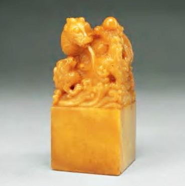 日期:2004-06-24 說(shuō)明:石質(zhì)均勻,色澤溫潤(rùn),所刻獸鈕精細(xì),用刀流暢,將瑞獸的肌骨表現(xiàn)的恰到好處,雙目眉唇細(xì)致講究,材質(zhì)碩大,是近年拍賣(mài)場(chǎng)上最重的,重256克。田黃"無(wú)根而璞"無(wú)脈可尋,粒不大而難求,每顆重量在十幾克至百余克,數(shù)百克的極為罕見(jiàn),逾斤的貢至皇帝。清代藏家每得一田黃,顧視珍惜,"雖強(qiáng)勢(shì)強(qiáng)力不能奪",贊曰:"令玉稱(chēng)臣"。田黃有六德:細(xì)﹑潔﹑潤(rùn)﹑膩﹑溫﹑凝(晶瑩剔透)。據(jù)傳,乾隆皇帝每年元旦祭天必置田黃石于供案中央,意寓:福(產(chǎn)于福建)﹑壽(壽山)﹑田(黃土一皇家的疆域)﹑吉祥無(wú)比。印文﹕"山東萊州府同知陽(yáng)湖人汪昉珍藏書(shū)畫(huà)金石之記。"汪昉〔1799-1877〕清,字叔明,號(hào)菽民,又號(hào)啜菽老人,陽(yáng)湖〔今江蘇常州〕人。道光二十四〔1844〕年舉人,官山東萊州府同知。豪飲善詼諧,善山水,筆意松秀,墨法淹潤(rùn),書(shū)臨趙孟俯。間作分﹑隸。尤精鑒賞。卒年七十九。