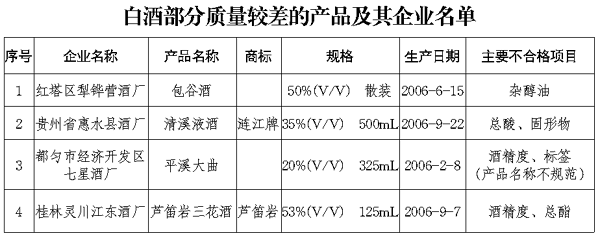 白酒行業(yè)抽查出的主要問(wèn)題有:個(gè)別產(chǎn)品雜醇油含量超標(biāo);個(gè)別產(chǎn)品酒精度達(dá)不到明示要求;乙酸乙酯含量不符合標(biāo)準(zhǔn)要求;個(gè)別產(chǎn)品總酯達(dá)不到標(biāo)準(zhǔn)要求;固形物指標(biāo)不符合標(biāo)準(zhǔn)要求。