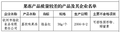 果凍:共抽查了全國(guó)32家企業(yè)生產(chǎn)的56種產(chǎn)品,產(chǎn)品抽樣合格率為92.9%。主要問題是甜蜜素、可溶性固形物不合格。