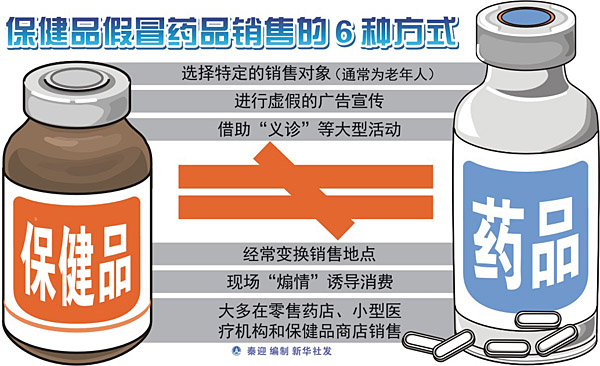 記者在采訪中了解到,保健品假冒藥品主要是通過在產(chǎn)品名稱、外包裝、功能和廣告宣傳上做文章,消費者需要小心辨別。 一是在產(chǎn)品名稱上做文章。1、從名稱上暗示對某種疾病有獨特的療效,如“耳貼靈”“骨質(zhì)增生一貼靈”“腳癬一次凈”“菌必凈”等。2、名稱高度仿藥品,如“慢炎舒檸”“慢咽舒寧”(仿國藥準字“慢嚴舒檸”)、“甘草片”(仿復方甘草片)、“雙黃蓮口服液”(仿雙黃連口服液)、“666皮炎平”(仿999皮炎平)等。3、直接用藥品名稱來命名,如使用已有藥品名稱川貝枇杷膏、婦科千金膠囊等。 二是在外包裝上做文章。1、仿造藥品包裝的圖案、風格。2、標示有藥品特有的標志,如藥典中收錄的主要成分、OTC標志、外用藥標志等。3、在包裝、標簽、說明書上標示“藥”“純中藥”“藏藥”等字樣。 三是在生產(chǎn)企業(yè)名稱上做文章。多仿藥品生產(chǎn)企業(yè)名稱,且有的產(chǎn)品確為藥品生產(chǎn)企業(yè)生產(chǎn)的。常見的有醫(yī)藥生物公司、藥業(yè)公司、制藥公司、生物制品公司、保健品公司等。 四是在功能上做文章。1、在包裝標志及說明書中直接標示[功能主治][適應證][用法用量]。2、主要成分均為藥典收載品種,在說明書中對主要成分分別描述功能主治、適應證,以暗示整個產(chǎn)品的治療作用。3、超出保健功能暗示對各種疾病有治療作用,有的甚至對療效作出承諾,其宣稱的適應范圍不但超出保健范圍,甚至超過同類藥品的適應范圍。主要集中在有關(guān)各類皮膚疾病、婦科疾病、糖尿病、心腦血管病、痔瘡、燒燙傷、跌打損傷等方面的產(chǎn)品,有些還宣稱能治療消化不良、鼻炎、鼻竇炎等。