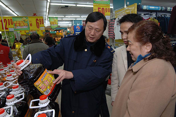 3月3日,重慶市工商局沙坪壩區(qū)分局的一名工商干部正在一個社區(qū)超市向消費者宣傳合格食用油的辨別方法和購買到偽劣食品的維權(quán)知識。 3月3日,為迎接“3·15”國際消費者權(quán)益日的到來,重慶市工商局沙坪壩區(qū)分局組織轄區(qū)內(nèi)的各個工商所深入到農(nóng)貿(mào)市場、超市、社區(qū)就國家新推出的《食品安全法》、辨別偽劣食品等貼近百姓生活的食品安全消費者維權(quán)知識針對經(jīng)營戶、普通群眾進行了廣泛宣傳,并進一步加大了對流通領(lǐng)域出現(xiàn)的偽劣食品經(jīng)營者、加工企業(yè)打擊力度。據(jù)了解,此項活動受到了當?shù)鼐用窈秃戏ㄊ称方?jīng)營戶的一致歡迎。 | |