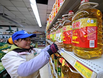 | 拉薩一家超市的售貨員在整理食用油柜臺(tái)。新華社記者 覺果