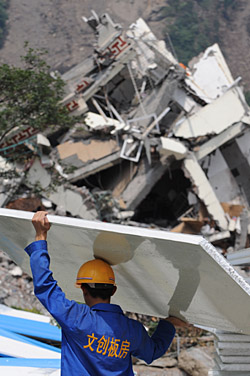 | 6月5日,工人們?cè)阢氪ㄓ承沔?zhèn)加緊建設(shè)活動(dòng)板房。新華社記者 武巍