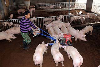 目前,相比今年3月份時(shí)的最高價(jià),山東地區(qū)生豬和豬肉價(jià)格的降幅分別為34%和30%。山東省畜牧獸醫(yī)信息中心分布在全省25個(gè)價(jià)格信息點(diǎn)的統(tǒng)計(jì)數(shù)字顯示,到11月9日,山東地區(qū)待宰活豬價(jià)格為11.17元/公斤,環(huán)比上周又下降1.24%;豬肉價(jià)格為18.20元/公斤,環(huán)比下降0.93%。記者還了解到,目前,山東省肥城市等一些地方的活豬交易價(jià)格,已出現(xiàn)10元/公斤的低價(jià)。 山東畜牧部門統(tǒng)計(jì)顯示,2008年3至4月份,山東地區(qū)生豬價(jià)格就在上下震蕩中呈現(xiàn)下滑態(tài)勢(shì),4月底往后,下滑越來越快:4月28日,山東地區(qū)活豬價(jià)格為16.86元/公斤,8月25日降到13.1元/公斤,到11月初降到11元/公斤左右。 記者了解發(fā)現(xiàn),目前,山東地區(qū)大型養(yǎng)殖場和散戶都面臨虧本。 大型養(yǎng)殖場:山東省鄒平縣長山鎮(zhèn)養(yǎng)豬大戶李元(化名)給記者算了筆賬:目前,當(dāng)?shù)赜衩變r(jià)格約為1470元/噸,豆粕價(jià)格約為3500元/噸,豬料價(jià)格達(dá)2.3元/公斤。自繁自育100公斤肥豬,成本超過10.5元/公斤,目前生豬價(jià)格約為11元/公斤,已接近盈虧平衡點(diǎn)。李元目前存欄能繁母豬600頭,存欄仔豬及育肥豬5000余頭,壓欄仔豬2000余頭。“生豬價(jià)格連續(xù)走低,養(yǎng)豬戶不敢購豬育肥了!彼麩o奈地說。 散戶:自繁自育剛剛保本,購買仔豬育肥每頭賠100元左右(100公斤)。山東省肥城市老城鎮(zhèn)毛小莊村村民王軍目前存欄母豬6頭,仔豬30頭。他說,當(dāng)?shù)刭徺I一只豬仔要花400元左右,育肥飼料需要800元左右;再加上用藥費(fèi)用、人工費(fèi)用,成本合計(jì)超過12元/公斤。目前當(dāng)?shù)鼗钬i價(jià)格為11元/公斤,還沒扣除運(yùn)費(fèi),每頭肥豬虧本超過100元!叭ツ赀@個(gè)時(shí)候,當(dāng)?shù)孛款^肥豬售價(jià)2300多元,利潤能到400多元!蓖踯娬f。 王軍目前還不敢淘汰母豬,因?yàn)楝F(xiàn)在母豬價(jià)格僅8元/公斤左右,“賣了就把本都賠光了!钡,毛小莊村部分散戶已開始淘汰母豬打算退市了!翱催@架勢(shì),生豬價(jià)格還得落,年底可能10元/公斤都沒人要了。”王軍擔(dān)心地說。