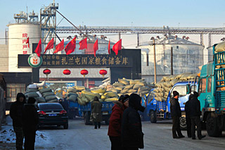 | 2月3日,滿載糧食的車輛在內(nèi)蒙古扎蘭屯國(guó)家糧食儲(chǔ)備庫(kù)門口排起長(zhǎng)隊(duì)。新華社發(fā)(王澤蔚
