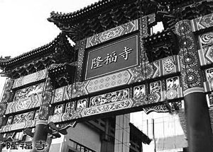 | 早先隆福寺廟會熱鬧的場景已難尋覓,而這個后建的牌樓卻讓人們記住了它。 | 隆福寺廟始建于明景泰一年(公元1452年),清雍正元年重修。隆福寺的廟會,已有二三百年的歷史。據(jù)《大清一統(tǒng)志》載:“隆福寺,逢每月之九、十有廟市,百貨駢闐,古玩字畫,風味小吃,花鳥魚蟲——,為諸市之冠!鼻寮螒c寫于二十二年的《草珠一串》載:“東西兩廟貨真全。一日能銷百萬錢,多少貴人閑至此,衣香猶帶御爐煙”。說明當時隆福寺廟會繁榮的光景。而真正的繁榮是在清末時期,即光緒二十七年(1901年),隆福寺廟宇毀于火。燒毀天王殿后,迄未重修。廟中喇嘛將地皮按塊租給攤商,收取地皮費,名為香錢。那時,廟會已改為逢每月一、二、九、十日開市。這個處在內(nèi)城中心區(qū),居民密集,最大的隆福寺廟會與西城護國寺廟會東西對應,被稱為東廟與西廟,形成城區(qū)兩大雜品市場。經(jīng)營品種上至綢緞布匹,下至花鳥魚蟲,無所不有,當然小吃品種更是遍布廟會各個角落。但多數(shù)小吃攤商,還是集中在廟會西側(cè),這里有殘存西配殿,一些賣茶湯、油炒面、豆汁、杏仁茶等流食的小座商在此還設有座位,桌上鋪有潔白桌布,門臉上懸掛白布簾,這在當時的廟會上,衛(wèi)生條件算是一流的了?蓜e小看這些小座商、攤商、推車和擔擔者,其中不乏精工細致,饒有風味的品種。如扒糕、灌腸、炸丸子、羊霜腸、爆羊肚、驢打滾、吊爐燒餅、餛飩等等,以現(xiàn)在技術(shù)水平衡量,亦稱上乘。不少老北京市民特意到廟會吃上一盤豌豆黃、灌腸,以飽口福。 至今這里的小吃店還頗有名氣,保留著一些傳統(tǒng)品種,受到老北京人的歡迎。廟會上洋煙畫攤前也常常是擠滿了人,過去有搜集洋畫片的,和現(xiàn)在集郵相似,因此產(chǎn)生了交換洋煙畫的“自由市場”。隆福寺后門通錢糧胡同聚集著很多乞丐,等候逛廟的人給他們一些施舍。 新中國成立后,政府將各種攤販集中在廟前的大棚內(nèi),固定攤位,獨自經(jīng)營。名曰“東四人民市場”,后改為國營百貨商場。上世紀80年代又把前面只有一層的營業(yè)大棚拆掉,換了一座高八層,設備先進的商業(yè)大廈,改名為“隆福大廈”。原隆福寺廟的建筑已蕩然無存。