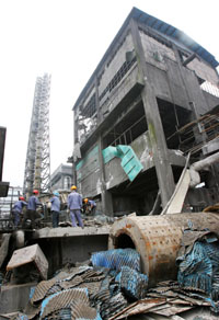 積極自救,恢復(fù)生產(chǎn)。5月24日,在四川什邡市鎣華鎮(zhèn)鎣峰實(shí)業(yè)有限公司內(nèi),工人們?cè)谇謇須牡膹S房。新華社發(fā)(戚振林