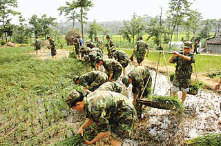 | 6月2日,在安縣塔水鎮(zhèn)油房村,某裝甲團(tuán)戰(zhàn)士幫助農(nóng)民栽插秧苗。汪曉東