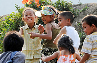 | 6月5日,幾名映秀心連心學(xué)校的學(xué)生在放學(xué)路上嬉戲。目前,學(xué)校一共有學(xué)生17名,包括從幼兒園、小學(xué)到初中各年齡段的孩子。他們在這里除了正常學(xué)習(xí)外,更多的是接受心理輔導(dǎo),以幫助他們樹立信心,走出災(zāi)難的陰影。新華社記者