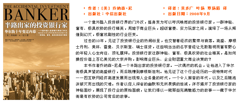 與投資銀行的第一次親密接觸 并購組的銀行家們不得不花費大部分時間思考挖掘項目,進(jìn)行電話營銷,偶爾得到機會就去向客戶正式推銷(pitch)他們的服務(wù),盡管幾乎每次都以失敗告終。投資銀行向客戶推銷金融服務(wù)時,通常會使用一種道具,這種在投資銀行家生涯里舉足輕重的東西就叫做“建議書”。即使在今天,不管是倫敦還是別處,胡亂編就一本本厚厚的建議書可能是從事投資銀行的年輕分析員和經(jīng)理們最感乏味的事情。[查看全文]